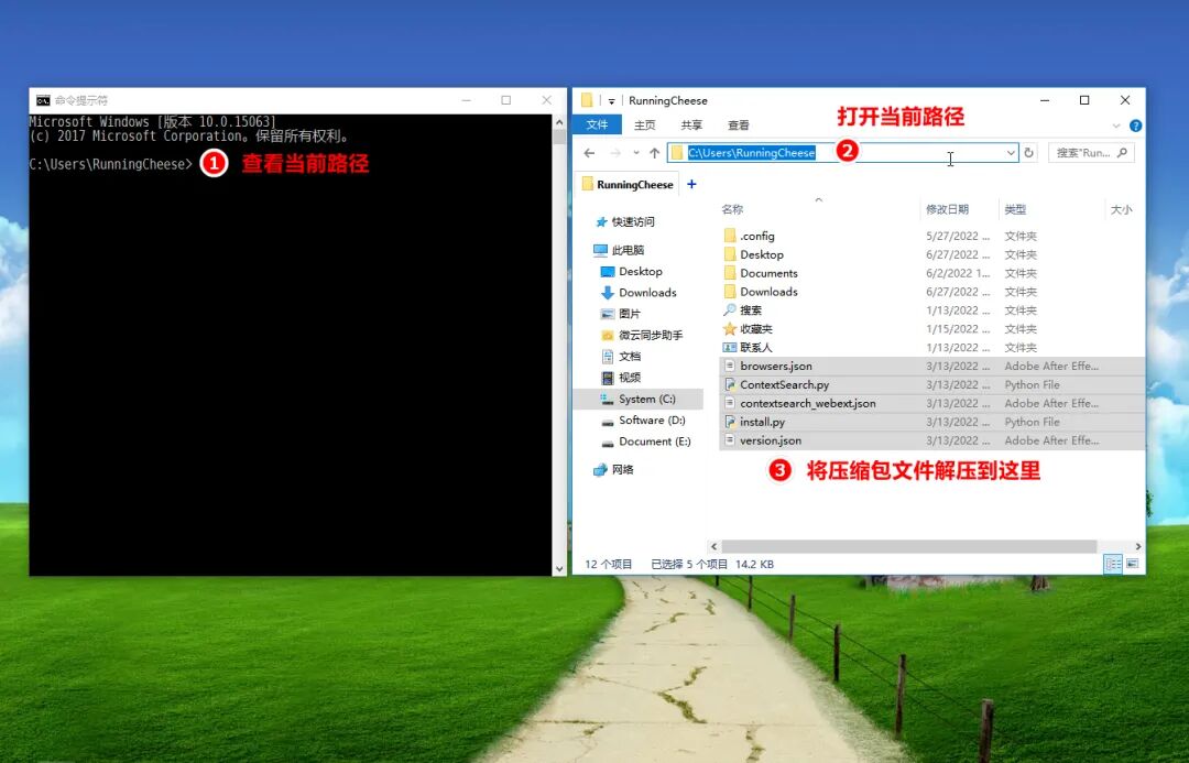 按 Windows 键,输入 cmd 回车,在弹出的窗口里查看当前目录,比如我的是 C:\Users\RunningCheese。