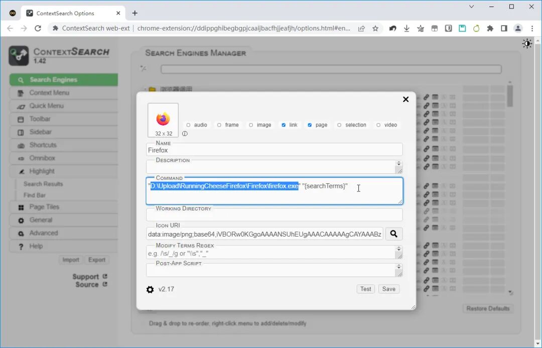 "D:\Upload\RunningCheeseFirefox\Firefox\firefox.exe" -profile -no-remote "D:\Upload\RunningCheeseFirefox\Profiles - TEST" "{searchTerms}"