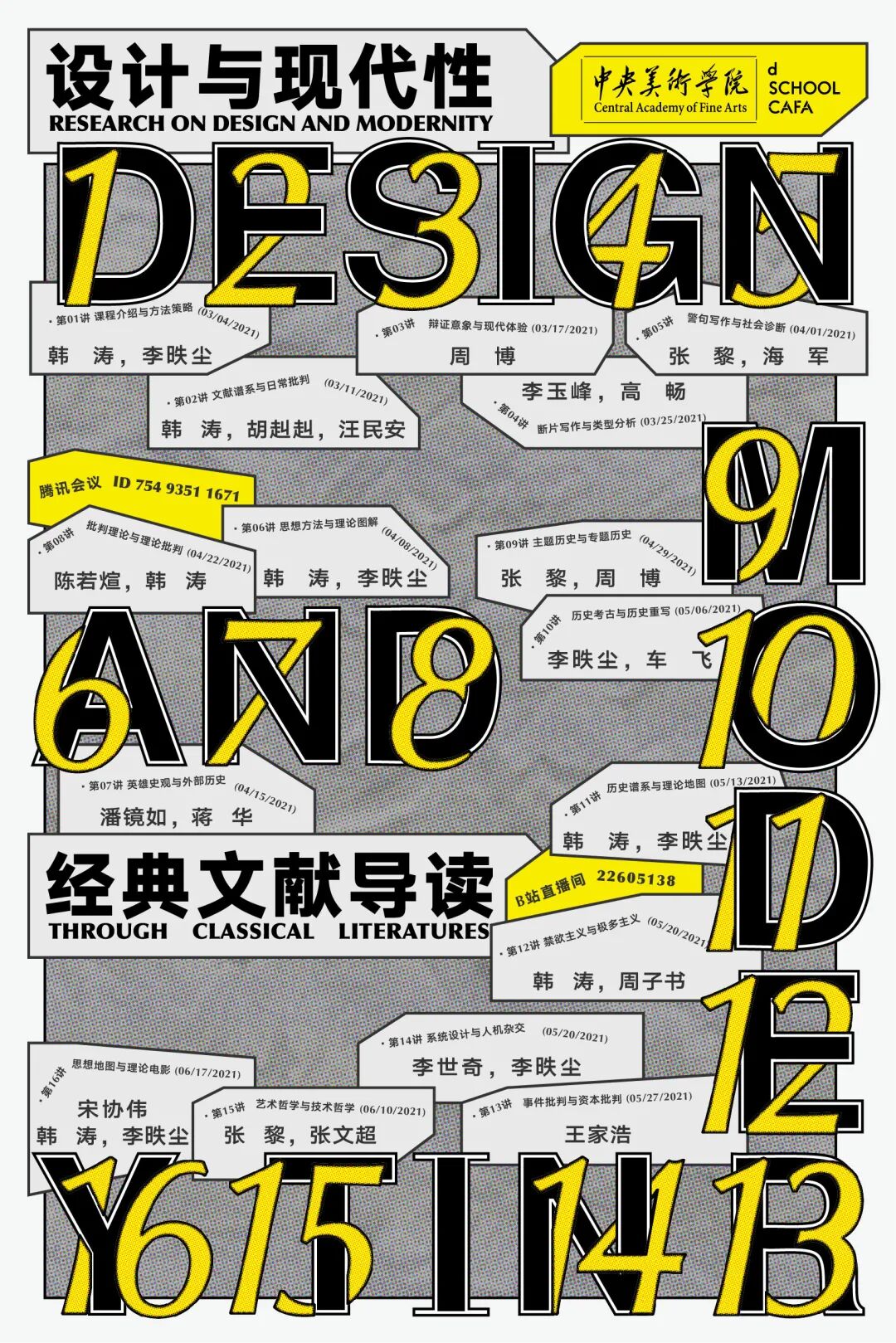 2021年每次课程分为“学者导读”讲座和“课程讨论”两个环节,总计三小时。课程上半部分以两位学者的专题讲座为主线,关注如下两个问题:一方面,从宏观层面,重点关注文献背景、主旨内容与结构研究,即理解这些文献对设计与现代性议题展开的重要论断以及在目录结构层面体现出的整体架构框架;另一方面,从微观层面,重点关注文本细读、案例研究与比较研究,即在每一讲讨论文献中,选出关键段落、关键句子、关键术语,结合作者心理分析,比较、对比或对仗不同学者研究方法与文本写作的差异。课程下半部分为学生研究小组的汇报与图解实践为主线,重点关注如下两个问题:一方面,研究生研究小组内部主要专注用不同视角对同一专著展开不同的方法的阅读;另一方面,研究生研究小组关注如何通过新的文献摘要、信息表达、图解工具与作业形式,具体的实践形式中逐渐掌握批判性研究方法,以及展开具有学科知识生产价值的再创造。