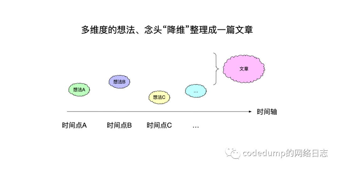 从这个意义上来说,用只有一个物理维度的“笔记”,来试图存储维度不限的想法、念头,并不适合。这种做法相当于把多维度的想法、念头给降维了。什么时候更适用于这类“降维”的写作行为?我认为是在思考已经很清楚,能够把想法、念头整合在一篇完整的文章时才适合,这时候这篇输出的文章是经过整理、且有完整的观点的。