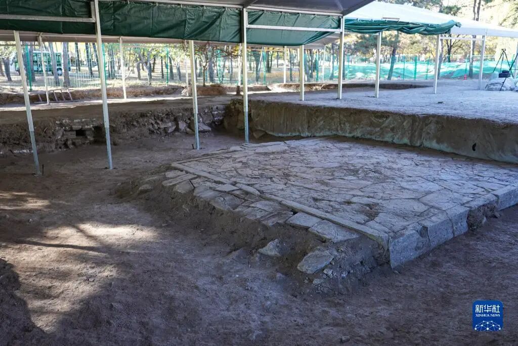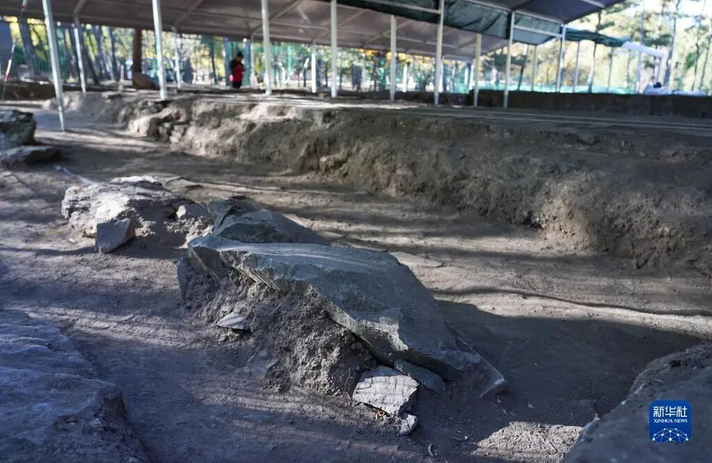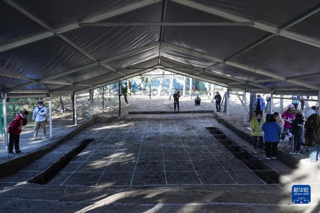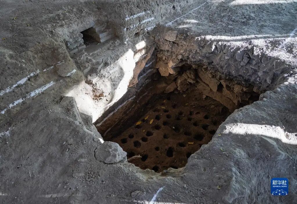 11月4日拍摄的“田字房”建筑台基基槽底部密集的地钉孔和其上方的排水暗沟。新华社记者 陈钟昊 摄