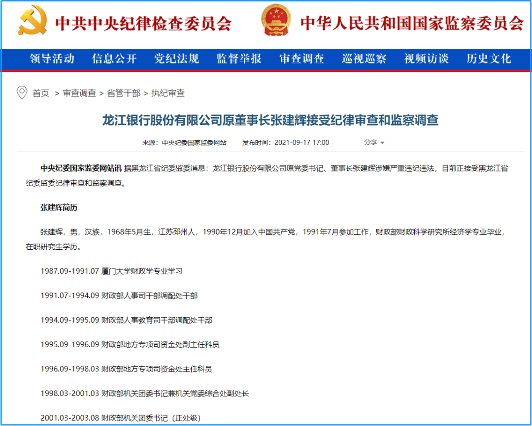 据黑龙江省纪委监委消息:龙江银行股份有限公司原党委书记、董事长张建辉涉嫌严重违纪违法,目前正接受黑龙江省纪委监委纪律审查和监察调查。