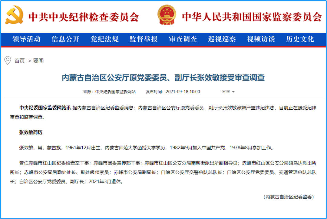 据内蒙古自治区纪委监委消息:内蒙古自治区公安厅原党委委员、副厅长张效敏涉嫌严重违纪违法,目前正在接受纪律审查和监察调查。