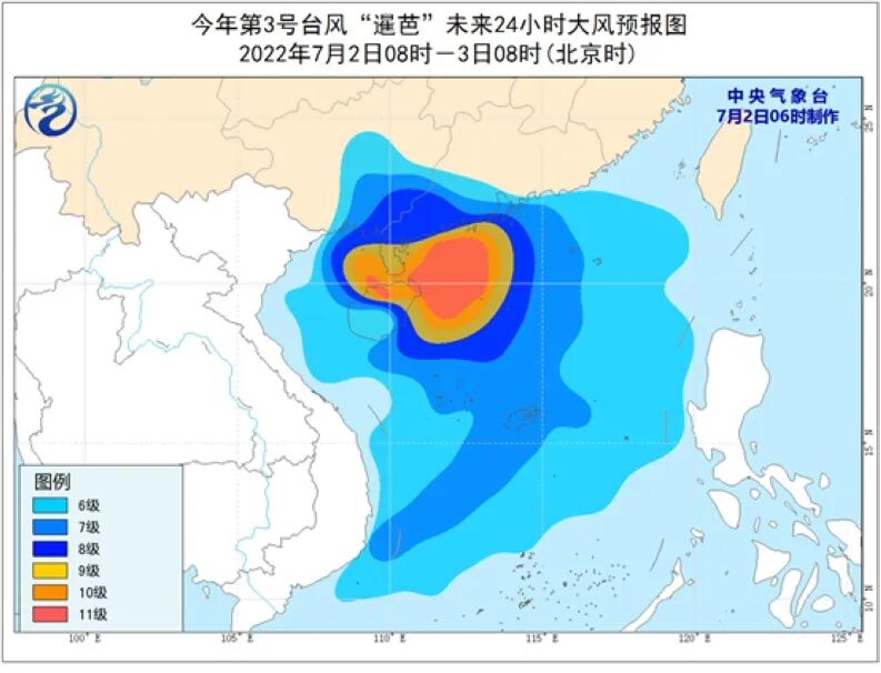 大风预报:7月2日08时至3日08时,南海大部、广东西部沿海、海南岛大部、广西东南部沿海、西沙和中沙群岛附近海域、北部湾和琼州海峡将有6-8级大风,部分海域或地区风力有9-10级,台风中心经过的附近海域或地区风力可达11-12级,阵风13-15级。