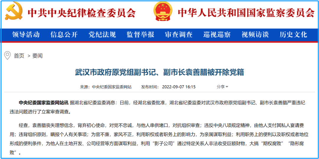 日前,经湖北省委批准,湖北省纪委监委对武汉市政府原党组副书记、副市长袁善腊严重违纪违法问题进行了立案审查调查。