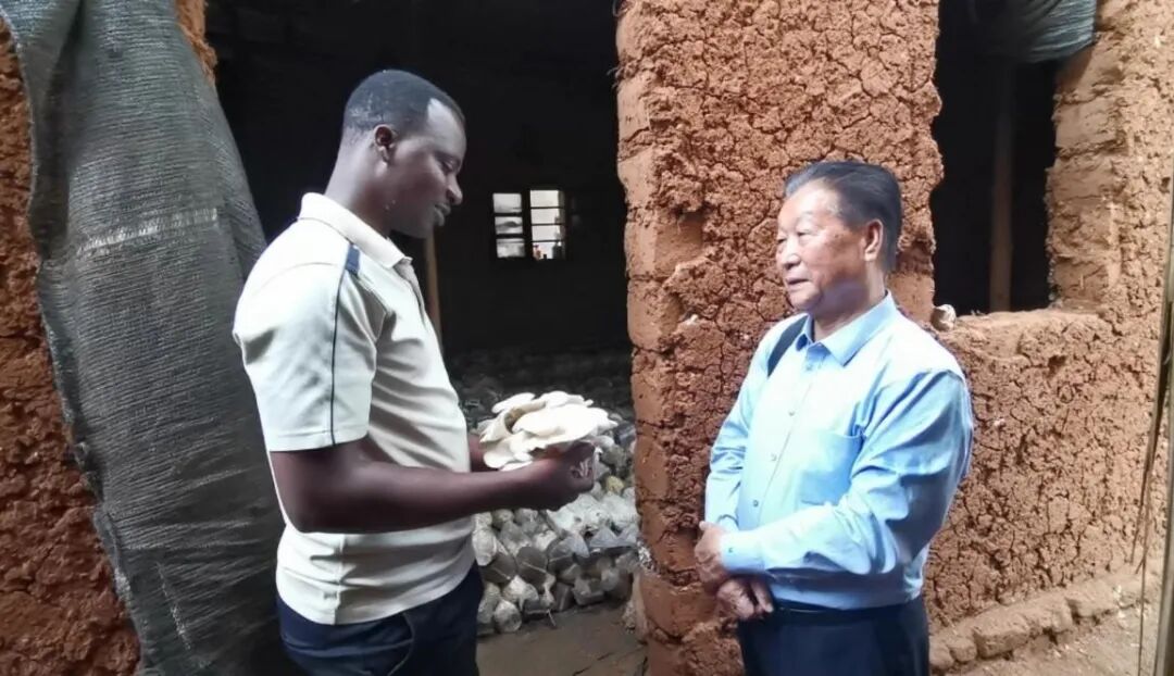 2019年,林占熺在卢旺达指导当地农户菌草种菇。图片来源:国家菌草工程技术研究中心