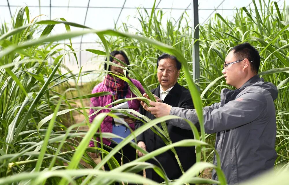 菌草专家林占熺(中)在宁夏银川市永宁县闽宁镇农户刘昌富的大棚里查看菌草生长情况(2021年3月29日摄)。新华社记者 王鹏 摄