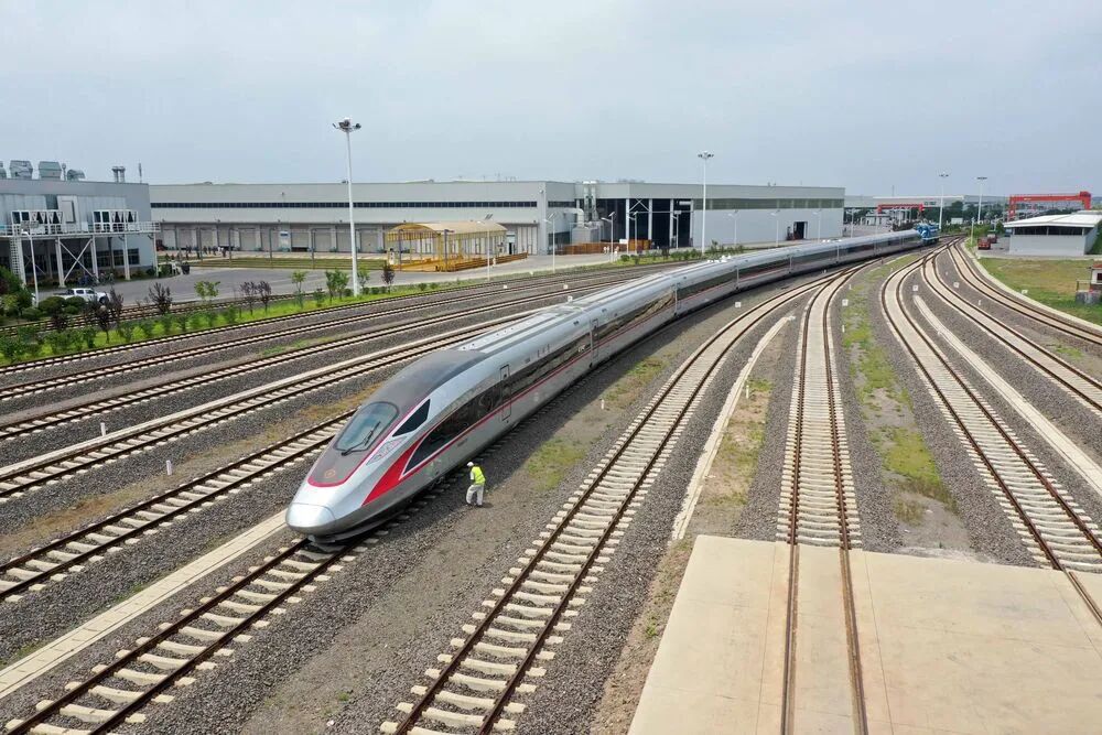 在位于山东青岛的中车四方股份公司,一辆复兴号列车正在出厂(2021年7月1日摄)。新华社发