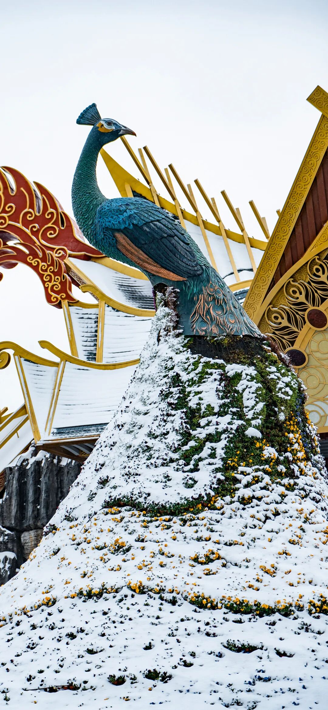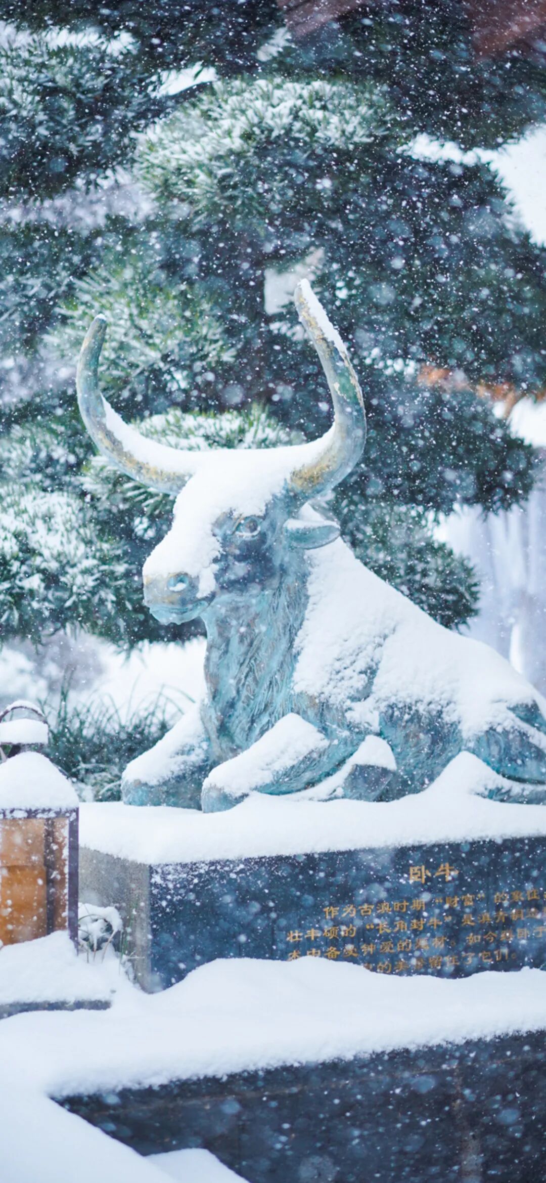 巧遇卧牛披雪,牛角茸茸,牛头粉面,白雪将青铜的肌理掩盖,平日威风凛凛的铜牛竟显露出几分久违的可爱。
