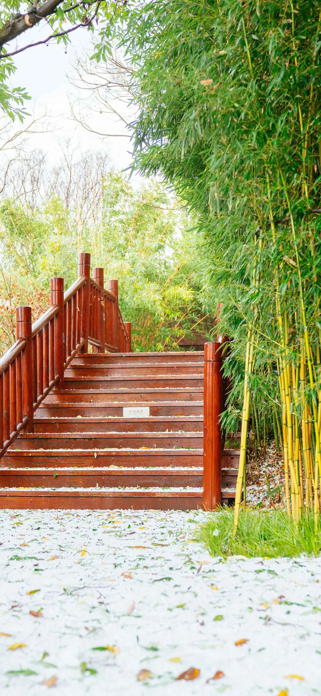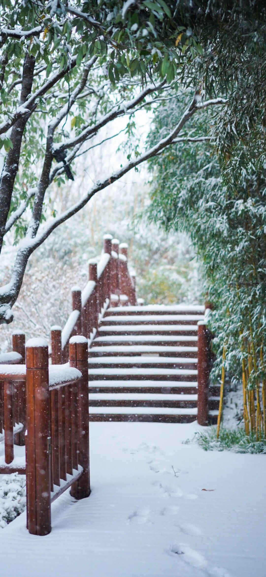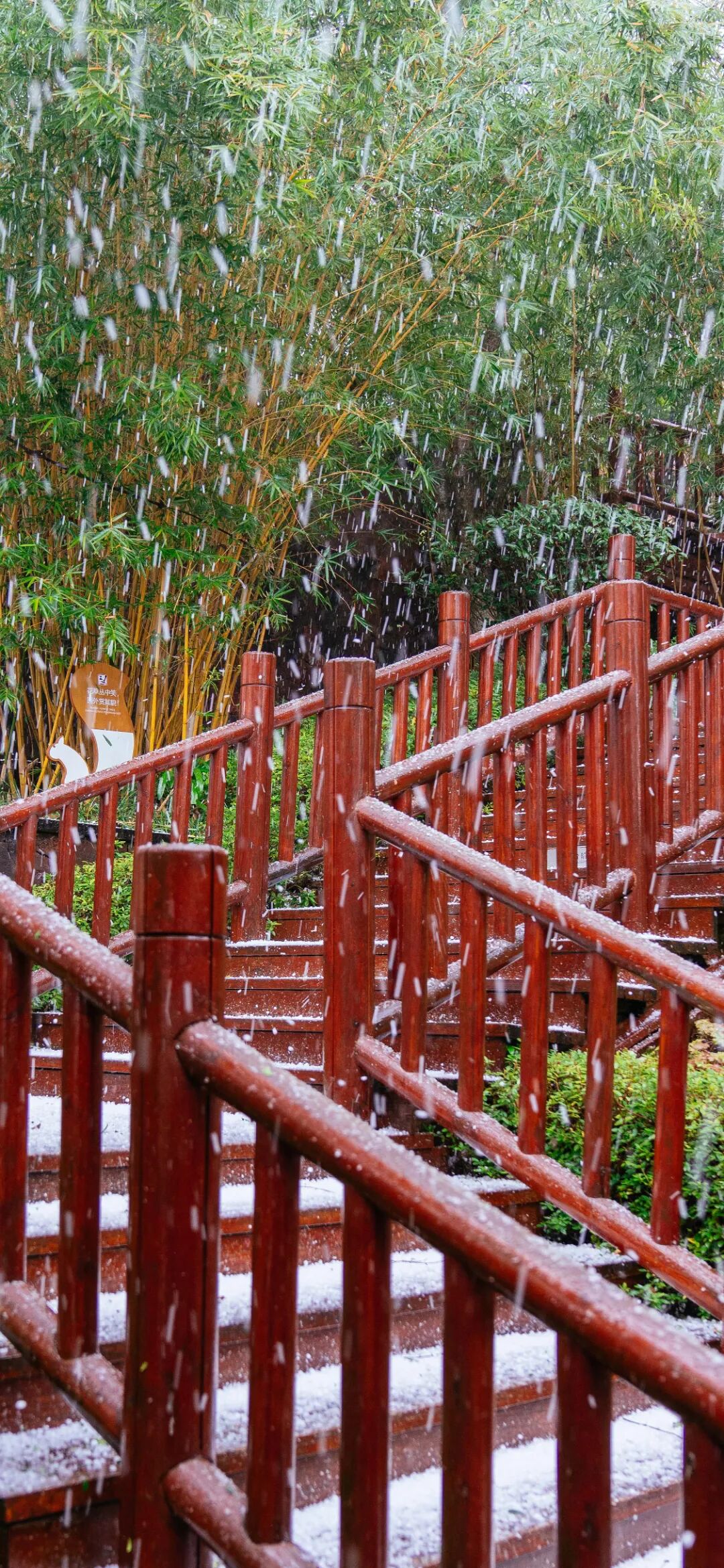 竹林栈道的雪尤其厚实,一路走来,身后留下浅浅足印,不见原木朴色,傲然的青竹也难得弯了头。