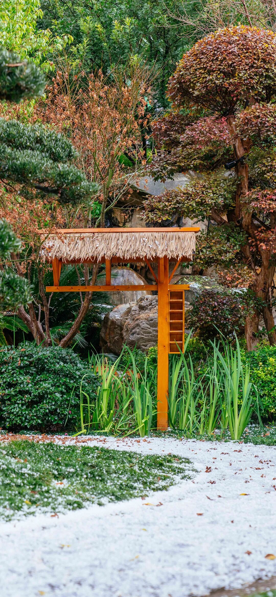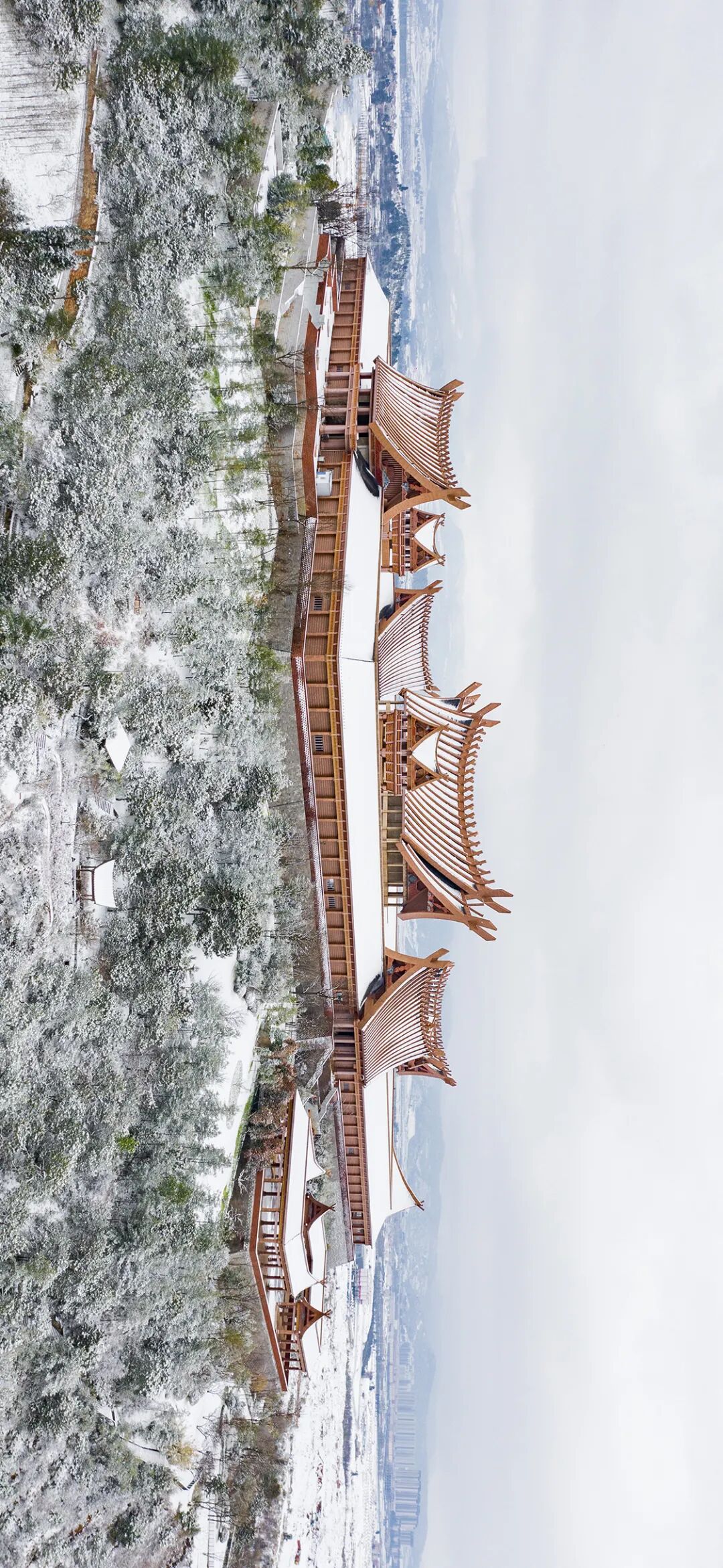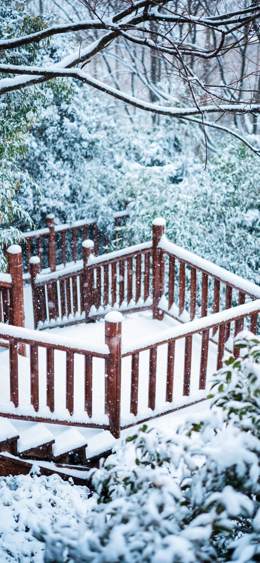 竹林栈道的雪尤其厚实,一路走来,身后留下浅浅足印,不见原木朴色,傲然的青竹也难得弯了头。