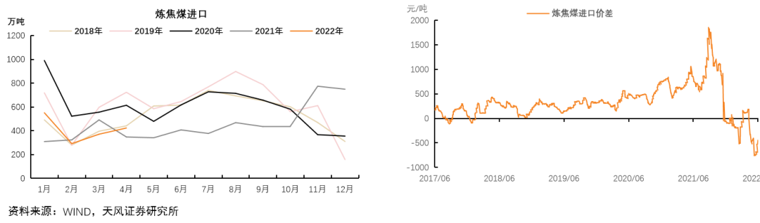 进口继续下滑:2021年澳洲炼焦煤进口同比减少2918万吨,但进口总量却只下降了1797万吨,主因在于进口利润驱动下北美炼焦煤大幅增加,而2022年进口倒挂下,北美炼焦煤更倾向于其他国家的发运。