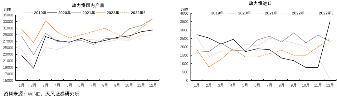 国内生产有增量:动力煤下游需求以发电为主,因此是保供主力,随着晋陕蒙动力煤矿产能的不断核增,国内产量仍然居高不下,我们预计2022年动力煤产量同比去年增加2亿吨。