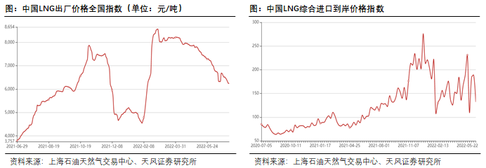 国内LNG价格年初迅速上涨,4月后虽有回落但仍处于高位:国内LNG价格由1月27日的4601元/吨快速上涨至3月2日8568元/吨的高点,涨幅高达86.2%;截至6月28日价格回落至6252元/吨,但仍大幅高于去年同期3795元/吨的水平。
