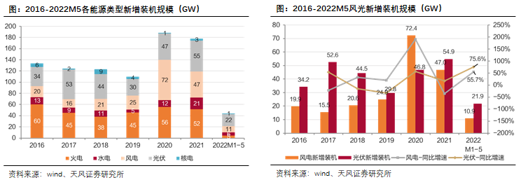 风光装机增长势头迅猛,2021M1-5风、光新增装机分别为11、22GW,分别同比+56%、+70%。同时,2022M1-5光伏组件招标79GW,M1-6风电招标53.46GW,风光招标量持续高位,未来装机增长势头不减。