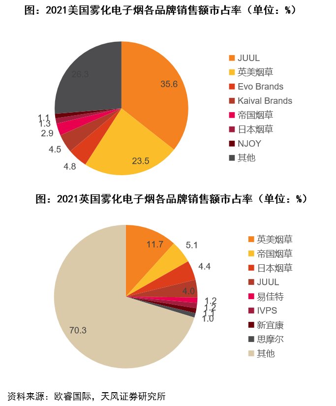 中国雾化电子烟品牌跻身全球阵营。2021年我国电子烟品牌悦刻在全球的市占率跃升至8.9%,成为全球第三大电子烟品牌,力压帝国烟草与日本烟草;除悦刻外,我国本土的其他电子烟品牌也在其他国家和地区有不错销售表现,代表公司有易佳特、新宜康、思摩尔等。
