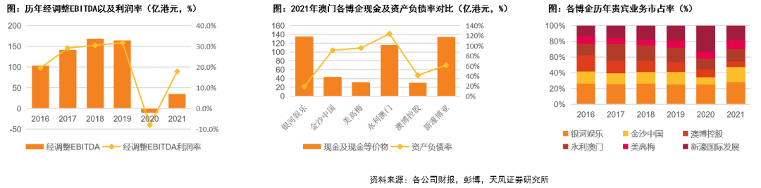 全球领先的度假城、酒店及博彩企业。近年公司盈利能力稳步提升,疫情前2019年实现经调整EBITDA 164.79亿港元,经调整EBITDA利润率为32%,疫后旅游限制放宽业绩快速回弹,2021年博彩业务实现净收入140.1亿港元,同比增长63.6%,占比71.13%,非博彩业务实现收入26.63亿港元,同比增长69.5%,占比13.52%,经调整EBITDA利润率恢复至18%,同时公司现金流充裕,为六家博企最高,风险承受能力较强。