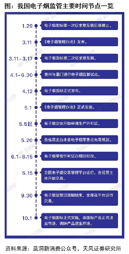 2)受理进程:根据《电子烟》微信公众号报道,截至6月30日,国家烟草专卖局官网显示已经有35家电子烟企业获得烟草专卖生产企业许可证。我们认为主管部门完成对其他相关提报申请的企业进行初核和审核程序后,国内市场近期或将陆续迎来更多数量的生产许可证落地和发放。