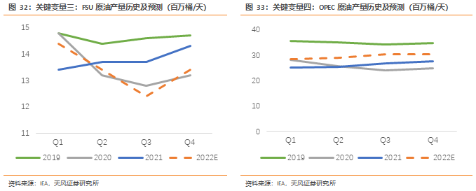3)俄罗斯受制裁影响,2022Q2/3预计环比下降,Q4预计随着航线调整回升。前五轮制裁落地后,俄罗斯产量有所下降,但是受益贸易路线调整、实际出口量下降并不明显。第六轮制裁落地,此后Q3我们预计仍会影响一定幅度的俄油产量和出口量。但是随着愿意冒风险的买家和船公司出现,预计俄罗斯的产量和出口量在Q4有望恢复一部分。