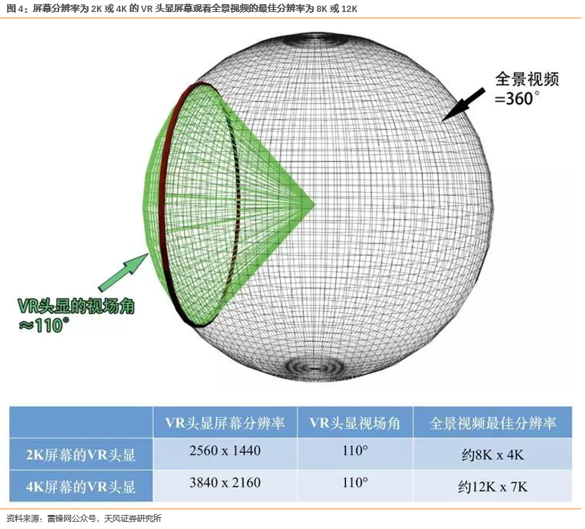 VR头显的视场角一般是110°左右,全景视频是一个360°的球体,相当于VR头显视场角的3倍多。VR头显屏幕分辨率一般为2K或4K,因此全景视频的最佳分辨率也是其3倍多,即8K或12K。只有达到这样的分辨率才能有优秀的观影体验,然而这样的分辨率对于宽带速率要求是极高的。