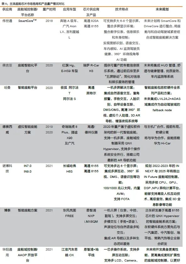 座舱芯片兼顾高安全性、高算力、低功耗等特点是未来发展趋势。高通布局多款芯片产品,技术与市场优势逐渐明显,传统汽车SoC芯片厂商的产品多用于中低端车型,市场份额被挤压,此外本土企业开启发力