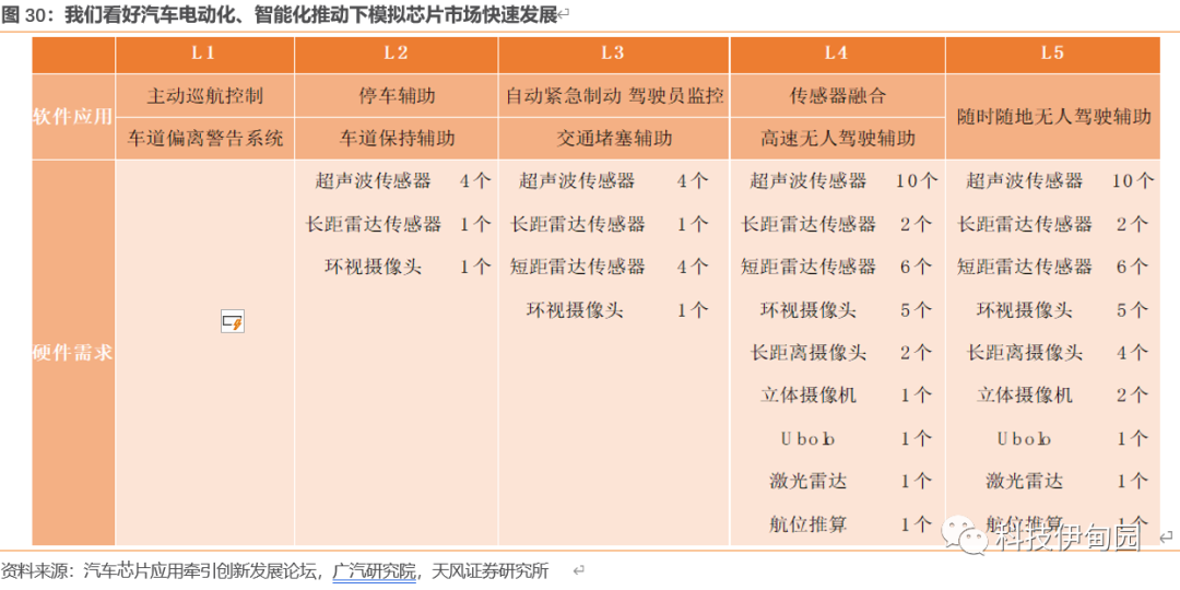 智能驾驶通过传感器获得大量数据,L2级别的汽车预计会携带6个传感器,L5级别的汽车预计会携带32个传感器(超声波雷达10个+长距离雷达传感器2个+短距离雷达传感器6个+环视摄像头5个+长距离摄像头4个+立体摄像机2个+Ubolo 1个+激光雷达1个+航位推算1个),较L2增速显著。可见模拟芯片是自动驾驶系统的必备零件。