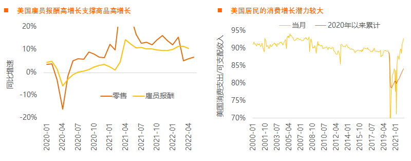 美国居民的超额储蓄也将支撑零售增长,2020年以来累计消费支出/可支配收入较低。