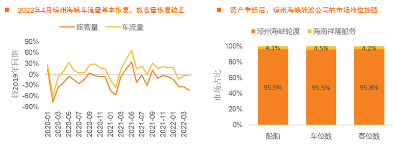 2022年以来琼州海峡车流量恢复较快,旅客量受疫情影响大幅下挫,5月起有望反弹