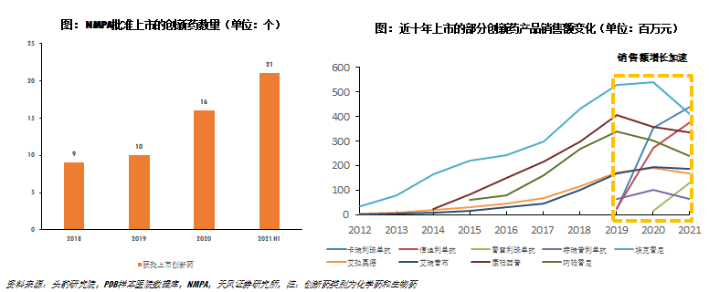 近年来创新药上市后销售额增速加快。根据PDB样本医院统计的销售数据,近年上市的信迪利单抗、替雷利珠单抗和卡瑞利珠单抗等,上市后销售额增速高于康柏西普、阿帕替尼、埃克替尼、艾拉莫德以及艾瑞昔布等5或10年前上市产品的上市后销售额增速。