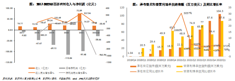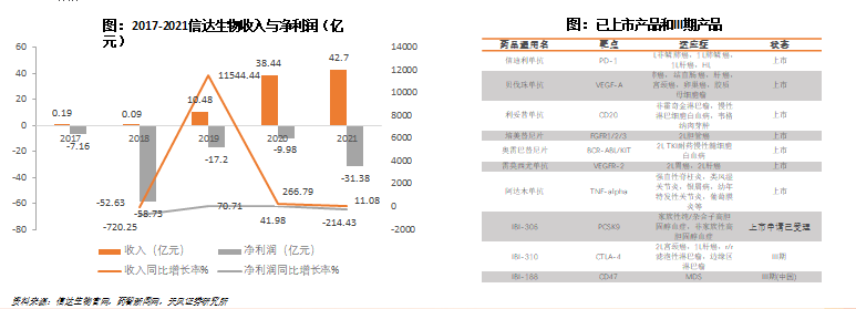 百济神州:研发管线储备丰富,国际商业化打开收入增长空间百济神州经过十余年的发展已成长为具备和国际MNC药企同台竞争实力的中国创新药公司。2021年和2022Q1公司收入分别为75.89亿元和19.48亿元,同比增长258%和下降50%。2022Q1同比下降主要是由于去年同期大额授权费用确认收入所致。2022Q1产品收入约16.62亿,同比增长141%。百济神州拥有14款自主研发品种,合计开展超30项在研管线。公司具有成熟的国际化临床试验研发和运营能力,可延续的梯度管线布局,在研管线和商业化产品具有全球竞争力。截至2021年,已在45+个国家和地区启动了100+临床试验,30+项已申报或潜在注册可用的临床试验。公司商业化能力日益成熟,超3000人商业化团队,2款核心自研产品收入保持高速增长,并且或有加速增长的趋势。百济神州自研品种收入占比超75%,成为主要收入贡献。2022Q1自研创新药泽布替尼和替雷利珠单抗分别收入为1.04亿美元和8760万美元,同比增长372%和79%。美国FDA已受理泽布替尼用于治疗CLL/SLL适应症的上市申请,我们预计若泽布替尼在美用于治疗CLL/SLL适应症获批上市,有望带动泽布替尼收入进入加速增长阶段。信达生物:多款创新药进入商业化,多领域拓展成长空间p信达生物2021年公司收入为42.7亿元,同比增长11.08%;净亏损-31.38亿,同比扩大214.43%。六款药物持续放量,产品收入达到40.01亿元,同比增长69%。截至2022年7月1日,信达生物拥有7款已上市产品和多款III期临床阶段产品,迈入产品上市收获期。2021年信迪利单抗收入约27亿。信迪利单抗新增三项适应症获批上市,包括一线非鳞状非小细胞肺癌、一线鳞状非小细胞肺癌和一线肝细胞癌,均成功纳入医保目录,有望继续推动信迪利单抗放量。信迪利单抗具有单药适应症以及广阔的联合用药适应症拓展空间。IBI310处于关键临床II /III期、IBI188(中美临床进度不同)等产品处于关键临床III期阶段;IBI-112,IBI-362等产品的关键III期研究预计将于今年下半年启动。信达生物加快创新在研产品的管线的研发,新产品涉及多个领域。公司目前已经成功建立起32种高价值产品的产品链,在研产品涵盖一系列创新靶点和药物形式,覆盖包括肿瘤、代谢、免疫学等多个疾病领域。针对高胆固醇血症的PCSK9亿申报上市;针对超重适应症的IBI362(GLP-1R/GCGR双激动剂)II 期临床研究达到了主要临床终点和所有的关键次要临床终点。荣昌生物:具有ADC技术平台优势,差异化布局进入收获期荣昌生物积累了平台技术,包括ADC、双抗和融合蛋白。2021年和2022Q1公司收入分别为14.24亿元和1.50亿元,同比增长46672.72%和3406.56%。2021年和2022Q1公司收入同比增长主要是由于泰它西普和维迪西妥单抗上市销售,营业收入增加所致。荣昌生物拥有全面集成ADC平台,涵盖ADC开发及生产的全过程。目前,公司通过ADC技术平台研发的创新药有多种,其中维迪西妥单抗(RC48)已获批上市销售,成为中国首个获得美国、中国药监部门突破性疗法双重认定的ADC药物。2021年8月,荣昌生物宣布与SeagenInc. 达成独家全球许可协议,以开发及商业化维迪西妥单抗。荣昌生物自研创新药成为主要收入来源。公司凭借专业化销售团队面向医生推广产品,以促进产品在临床方面的差异化定位。2021年年内,泰它西普作为全球首个SLE治疗创新双靶生物制剂实现销售收入4730万元,在2021年年底通过国家谈判纳入国家医保药品目录。维迪西妥单抗上市半年实现销售收入8400万元,已获批胃癌和尿路上皮癌两个适应症。2021年底,胃癌适应症通过国家谈判纳入国家医保药品目录。贝达药业是中国第一批创新药公司,埃克替尼累计收入超100亿。2021年和2022Q1公司收入分别为22.46亿元和5.85亿元,同比增长20.08%和下降5.47%。2022Q1归母净利润0.84亿元,同比下降43.36%,主要系股权激励计划影响,剔除该影响因素后归母净利润为1.45亿元,同比下降1.93%。聚焦肺癌领域,适应症覆盖广泛。公司研发深耕肺癌领域,肺癌领域产品和在研产品覆盖了NSCLC中主要突变类型,包括EGFR突变、ALK突变、KRAS突变等。公司已有三款商业化品种埃克替尼、恩沙替尼和贝伐珠单抗。其中,埃克替尼术后辅助适应症于2021年经国家谈判纳入医保,恩沙替尼一线治疗ALK阳性NSCLC适应症于2022年3月获NMPA批准上市。2022Q1,埃克替尼和恩沙替尼销量分别实现同比增长19.56%和1103.87%。商业化品种数量持续增长,创新管线研发迅速推进。公司拥有17款主要在研品种,40余项在研管线持续推进,包含五款处于晚期临床研究或已递交上市申请的药物。处在临床研发阶段的在研项目包括PD-1单抗Balstilimab、CTLA-4单抗Zalifrelimab、CDK4/6抑制剂BPI-16350、RTKs抑制剂CM082等,布局热门靶点,为公司长期发展提供动力。另外,PD-L1抑制剂BPI-371153、SHP2抑制剂BPI-442096两项实体瘤临床IND申请均于1月获批,公司肿瘤免疫布局稳步开展。得益于公司独创CRDMO\CTDMO业务模式,叠加“跟随分子-跟随客户-跟随科学”服务战略,2021年营收同比增速为38.50%,2022Q1收入同比高速增长71.18%。利润端,2021年公司归母净利润较2020年增长70.38%,2022Q1增速高达106.52%,平台间协同效应显著。公司资本开支延续高增长态势,产能将进入加速释放期。2020年-2022年持续加大资本开支力度,2021年为69.36亿,同比增长128.8%;2022年预计为90-100亿人民币,叠加公司行业龙头竞争优势,将有望支撑公司业绩稳定增长。CRDMO业务模式渐成熟,协同效应显著增强。公司持续