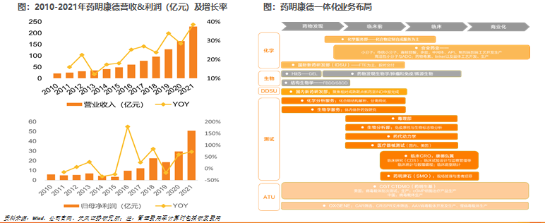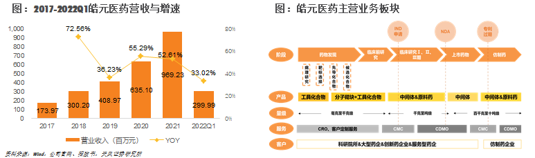 CDMO和生物试剂等业务。研发驱动结合全球品牌,高效赋能新药研发。分子砌块和工具化合物业务2021年营收同比增长57.60%,占比达56.23%,毛利率68.28%。该类产品主要用于药物发现,现有化合物库包含分子砌块超4.2万种、工具化合物超1.6万种。自主品牌乐研和MCE试剂平台分别负责国内、外客户渠道运营,助力快速开拓公司全球业务。凭借强大研发能力与全球化品牌,该业务板块市场份额有望持续扩大。搭建一体化CDMO服务平台,加速推进产能建设。原料药和中间体业务2021年营收同比增速为46.33%,占比约43%,毛利率近36%。公司与知名药企签订艾立布林、曲贝替定等高难仿药合作协议,通过技术授权实现收入并获得销售分成;2021年承接创新药CDMO项目173个,其中上市申报/获批项目8个;马鞍山产业化基地部分车间进入设备安装调试阶段,