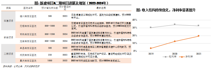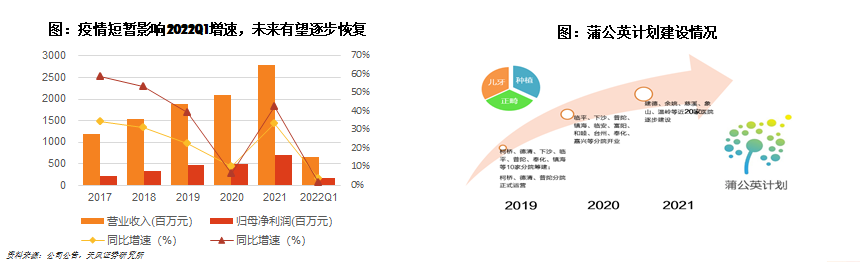 20.17%。爱尔眼科业务规模持续放量推动强劲的业绩增长和盈利增加。自2009年到2021年底,爱尔眼科营收及归母净利润从6.06亿元及0.92亿元分别升至150.00亿元及23.23亿元,增长到上市初的23.75倍和24.25倍,CAGR分别达30.66%及30.87%。陕西大型综合医院集团,收入规模持续放量。2021年公司收入29.21亿元,同比增长81.78%;归母净利润亏损4.28亿元,同比下降134%,主要由于医院前期固定成本较高所致。国际医学中心医院、高新医院业绩迅速增长。西安高新医院于2002年正式开诊,2009年获批成为中国第一家社会办医三级甲等医院。西安国际医学中心医院于2019年9月开诊,作为国内最大单体医院(最大规划床位5037张)。商洛医院新院区1800张床位已投入运营。国际医学中心医院2021年营收29.21亿元,同比+81.78%。高新医院2021年收入11.52亿元,同比+44.26%。多院区开诊在即,2022年床位数有望过万张。随着国际医学中心医院(目前开放1500张)床位逐步开放,高新医院二期(新增1000床)和商洛医院新院区(床位1800张)投入运营,辅助生殖中心和康复中心(床位3600张,稳步建设中)开业,3-5年内公司总床位有望突破10000张,医疗服务体量大幅提高。三星医疗:重症康复与公立医院有效协同,连锁康复大有所为2021年电力业务短期承压,2022Q1经营趋势向好:2021年实现营业收入70.23亿元,同比降低0.98%,归母净利润6.90亿元,同比降低27.83%,扣非归母净利润5.19亿元,同比降低25.86%。2022年Q1单季度实现营业收入19.82亿元,同比增长42.77%,归母净利润1.64亿元,同比降低3.23%,扣非归母净利润2.02亿元,同比增长40.63%。康复并购扩张持续推进,进一步扩大领先优势。公司2016年成立首家重症康复医院,并差异化选择重症康复发展道路,2021年收购杭州明州康复和南昌明州康复;公司目前形成了可持续拓展复制的模式,且具有一定的先发优势。2022年4月22日,临时股东大会通过南京明州康复医院等5家康复医院100%股权,根据股权激励考核目标,按照2022-2024年每年新增10家计算,截止至2024年底,公司医院数目有望达到35家,进一步扩大领先优势。智能配用电业务在手订单充足 ,抓住国内国外双重发展机遇。2021年公司累计在手订单67.07亿元,同比增长26.58%,其中国内累计在手订单45.53亿元,同比增长21.32%;海外累计在手订单21.54亿元,同比增长39.60%。根据电力股权激励,2022-2024年智能配用电业绩考核目标扣非净利润不低于5.91/7.72/10.00亿元。通策医疗:疫情致就诊需求略有延后,积极扩张蓄力长期发展疫情短暂影响2022Q1增速,未来有望逐步恢复。2021年公司实现收入27.81亿元,同比增长33.19%,归母净利润7.03亿元,同比增长42.67%,扣非后归母净利润6.71亿元,同比增长41.74%;2022年第一季度实现收入6.55亿元,同比增长3.74%,归母净利润1.66亿元,同比增长1.25%,扣非后归母净利润1.63亿元,同比增长0.99%。各项业务增势较好,2022Q1种植业务表现较好。2021年公司正畸业务实现收入5.34亿元,同比增长30%;种植业务实现收入4.41亿元,同比增长38%;儿科业务实现收入5.30亿元,同比增长32%;修复业务实现收入4.27亿元,同比增长25%。2022年一季度由于疫情影响,公司正畸业务实现收入1.24亿元,同比增长4.03%;种植业务实现收入1.02亿元,同比增长12.71%。门诊量持续快速增长,蒲公英计划稳步推进。2021年公司口腔医疗服务营业面积超20万平方米,开设牙椅2246台,口腔医疗门诊量达279.82万人次,同比增长28%。公司蒲公英计划稳步推进,2021年浙江省内布局医疗机构43家,8家处于筹备、建设、验收。存济体系医院中,武汉存济口腔医院2021年门诊量10.87万人次,同比增长82%,营业收入同比增长63%,实现盈亏平衡。海吉亚医疗:“内生+外延”双逻辑下,业绩兑现能力持续验证内生增长+外延并购,持续贡献业绩增长。2021年公司实现营业收入23.15亿元,同比增长65.17%;实现归母净利润为4.53亿元,同比增长155.9%。其中,医院业务占集团总收入92.9%,主要受益于:(i)存量医院收入的增长;及(ii)收购永鼎和贺州医院带来收入规模扩大。公司收入结构优化,净利率提升。2021年集团核心业务医院业务持续发力,该板块收入占比上升至92.9%。凭借集团精细化管理和规模化优势,医院业务板块毛利率稳步提升,由2020年30.4%上升至2021年30.8%。集团净利率由2020年12.6%提升至2021年19.6%。新建并购项目稳步推进,收入规模有望放量。2022-2024年间,重庆海吉亚二期、单县海吉亚二期、成武海吉亚二期预计开业,分别新增1000张、500张和350张床位。新建医院方面,德州海吉亚、无锡海吉亚预计于2023年开业,分别预计新增500和800-1000张床位。龙岩海吉亚和常熟海吉亚预计于2024年开业。截至2021年底,集团可开放床位超5000张,预计截至2023年底可开放床位突破10000张。中药:估值逐步回归合理位置,政策催化下基本面驱动是核心逻辑板块估值水平回归合理位置。相较于其他医药板块,中药板块估值长期处于中低位区间,在中药利好政策密集加码及企业经营改善的背景下,板块迎来估值及业绩双重修复。截止至2022年6月22日,中药板块平均PE为23X,相较于其他医药板块,板块估值已逐步回归合理位置。基本面驱动是核心逻辑,业绩兑现为首要考虑因素。在当前市场对于中药板块已经有充分认知的情况下,业绩兑现已成为首要考虑因素,竞争格局将是企业价值的核心筛选要素。2022年3月29日,国务院办公厅印发了《“十四五”中医药发展规划》,制定“十四五”时期中医药发展目标任务和重点