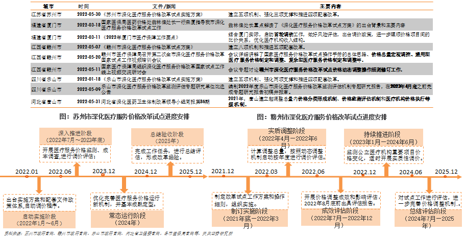 预计2022 年下半年陆续投产运营,将有效缓解产能不足短板。纵向延伸布局新型业务,打开增长新空间。公司较早开展ADC药物化学部分研发项目,开发出一系列高活性毒素、连接子和有效载荷,助力荣昌生物纬迪西妥单抗上市;推进安徽皓元ADC高活产线建设与参股臻皓生物,完善一站式ADC CDMO平台建设。同时,公司增资(1.44亿元)欧创基因、成立皓元生物研发中心和子公司皓元生化切入生物试剂业务,未来有望依托现有品牌优势开拓全球市场,为公司创造新业绩增长点。2021年8月31日国家医保局、国家卫健委、国家发改委等八部委发布《深化医疗服务价格改革试点方案》,目标通过3至5年的试点,探索形成可复制可推广的医疗服务价格改革经验。到2025年,深化医疗服务价格改革试点经验向全国推广。2022年5月4日国务院办公厅发布《深化医药卫生体制改革2022年重点工作任务》,要求各省份2022年6月底前印发建立医疗服务价格动态调整机制相关文件,年底前将医疗服务价格调出成本监审和价格听证目录。指导5个医疗服务价格改革试点城市探索价格调整总量确定规则、调价综合评估指标体系等配套措施。2021年11月24日,国家医疗保障局举办的深化医疗服务价格改革试点动员部署会在赣州召开,会上宣布将河北省唐山市、江苏省苏州市、福建省厦门市、江西省赣州市、四川省乐山市等5个城市列为改革试点城市。地方实践——云南省医疗服务价格调整:1300项整体调增28%价格改革思路将有升有降,但预计以升为主:2021年5月15日,云南省医保局、云南省卫健委发布《云南省2021年省级公立医疗机构医疗服务价格调整方案》,本次调整项目数共1300项,平均调增幅度 28.25%。其中调增项目 1113项,平均增幅36.4%;调减项目187项,平均降幅20.1%。调增的医疗服务项目主要为综合医疗服务、医技诊疗、手术治疗、物理康复等。本次拟调整医疗服务价格的服务项目成本均高于拟调整价格,体现技术服务劳务价值的手术、治疗类项目价格与成本偏离较大。调减的医疗服务项目主要是检查、检验类项目,