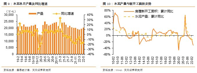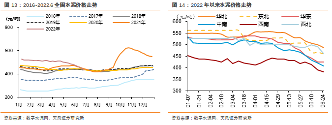 2022年以来,建材指数大部分时间跑赢沪深300和万得全A。截至2022年6月30日,CI建材指数较年初下跌4.8%,跑赢沪深300指数4.0pct,跑赢万得全A指数4.6pct。CI建材指数年度最高录得7.2%超额收益(较沪深300,4月11日),最大超额回撤为-1.7%(较沪深300,3月16日)。上半年除玻璃制造外,其他子板块相对收益均为正。截至2022年6月30日,建材细分行业中除其他专用材料外,绝对收益均为负,但从相对收益角度,除玻璃制造外,其他子板块相对收益均为正,其中其他专用材料相对收益最高。估值方面:截至6月30日,建材板块PE估值13.5x左右,基本回到20年初水平。分板块看,玻璃、玻纤、消费建材、耐火材料、水泥PE估值21年下半年以来基本处于下行通道。原因主要在于:大宗商品价格上升较快,叠加“恒大事件”引发市场对地产下游的担忧,以及国家层面的“房住不炒”强政策出台,导致建材公司21以来的PE估值下行,目前处于相对低位。我们认为随着地产基本面拐点的出现,板块整体估值有望迎来修复。1.2.1. 水泥:需求扰动下竞争加剧,供给秩序有望重塑地产新开工下滑拖累水泥需求,22年下半年开始需求压力逐渐缓解。水泥下游主要分为基建、地产和新农村建设三部分,从历史经验来看,水泥产量和地产新开工面积的相关性更强,在新开工增速高的年份,水泥需求都不差,而在新开工比较差的年份,水泥需求都较为疲弱,比较典型的是2015年,虽然当年基建强势增长17.2%,但新开工拖累下,水泥需求仍出现下滑。22年1-5月房屋新开工面积同比下滑30.6%,水泥1-5月产量7.8亿吨,同比下滑15.3%,产量创下近十年次低,仅高于疫情影响的2020年。受疫情、资金短缺、雨水天气频繁等因素影响,4、5月份需求旺季不旺,水泥出货率同比下滑2-3成,6月份降幅有所收窄,但淡季特征明显,需求未见明显好转。21年下半年开始水泥需求中枢开始下调,21年6月-22年6月是至暗时刻,我们认为22年下半年基建仍会继续发力,地产端环比或将出现好转,因此进入22年下半年,从同比角度,需求压力将开始逐渐缓解。供给端:年初错峰执行较好,但在需求超预期下滑的情况下,供给格局出现恶化。供给端,一季度错峰停产力度加大,使得在需求不佳的情况下,水泥价格仍保持高位,Q1全国水泥均价516元,同比高73元,但是后续需求恢复持续不及预期,行业整体库存接近7成,部分小企业几乎满库,在这种情况下,以单个区域市场为主的小企业降价出货的诉求更强,同时由于部分地区疫情因素,影响出现分化,导致区域间流动加剧,头部企业为维护市场份额,采取价格手段竞争,导致供给格局阶段性恶化,5月开始水泥价格加速下滑,5/6月全国均价分别下滑21/45元,华东地区水泥价格分别下滑35/52元,幅度高于其他地区。我们认为此次价格竞争本质原因是需求下滑幅度超预期引发的市场应对不足,但并不意味着供给协同的破裂,在淡季之后新的竞合关系或将形成,Q3旺季价格仍有望迎来快速提涨。1.2.2. 浮法玻璃:行业平均利润已为负,短期尚未出现集中冷修价格:22年以来终端地产项目进度持续推后,目前浮法产能、库存处历史高位(截至6月30日7129万重量箱),市场供需矛盾持续增加,导致浮法玻璃价格持续走低。单位利润:截至6月30日,月内平均行业利润为-199元/吨,较上月下跌159元/吨。成本方面原料价格继续小幅走高,原片价格再次下调,整体利空行业利润水平持续压缩。后期看,成本端大概率仍高位维持,当前多数原片厂价格已低于成本线水平,雨季过后我们认为Q3需求有望迎好转,叠加高成本支撑下提价可期。供给端冷修有限:浮法玻璃产能增量主要来自于产能置换新线投产、冷修线复产、产线转产等,产能减量主要来自于产线冷修和转产(如建筑超白转做光伏背板等)。2022年计划冷修产线约20余条(截止6月底冷修9条共计5350t/d),冷修进度略不及预期,计划点火产线14条左右(截止6月底共计10条7250t/d)。1) 传统旺季未至:正常年份看,一般上半年为相对淡季,下半年进入传统旺季。传统“金九银十”尚未到来,虽然目前行业多数企业亏损,浮法玻璃厂家存一定观望情绪;2) 现金流:浮法玻璃企业近年盈利良好,现金底气足可维持观望心态。1.2.3. 消费建材:龙头市占率逆势提升,α持续体现21年三季度以恒大为代表的大型房企开始出现信用违约问题,这使得大B客户收入占比高的建材类供应商主动收缩规模,从Q4收入表现来看,凯伦股份、亚士创能同比开始负增长,三棵树收入增速也出现环比较大下滑,而经销占比高,客户结构较优的企业在这一轮调整中受到的影响较小,22年一季度虽然地产基本面依然较差,销售、新开工、竣工面积同比均两位数下滑,但消费建材龙头企业仍然实现收入的正增长,龙头α持续体现,一方面因为在此轮地产调整中,小企业由于对单一地产客户依赖程度较高,一旦其绑定的地产商出现暴雷问题,那么小企业直接被拖垮,被迫退出市场,另外大企业的品牌力、供应能力等优势突出,更容易快速获取新的优质客户,市占率进一步提升,另外龙头企业下游中非地产类客户占比较高,这一部分需求韧性较强,对收入也起到一定的支撑。2021年原材料价格处于上行通道,企业Q1-Q3毛利率处于逐季探底过程,Q4开始东方雨虹、北新建材、兔宝宝等企业毛利率出现向上拐点,22Q1虽然原材料价格同比仍处于高位,但龙头企业毛利率已经企稳,部分企业如科顺股份、三棵树、亚士创能环比Q4实现上涨,面对原材