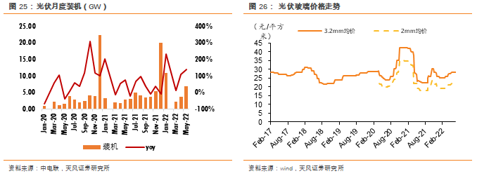 龙头市占率提升逻辑在持续兑现,中长期仍是主线。从消费建材竞争格局来看,只有石膏板行业龙头市占率较高,2021年北新建材市占率达到67.7%,行业呈垄断竞争格局,其他行业龙头市占率最高仅有20%左右,但从过去几年的变化趋势来看,行业集中度在持续提升,我们认为头部企业的提升空间仍然较大,21年以来份额有望加快增长:1)2021年受能耗双控、地产信用风险频发、原材料价格高涨等因素影响,部分客户结构单一、成本控制力不强、单耗较高的小企业主动或被迫退出市场,而大企业凭借渠道优势以及成本优势实现进一步扩张;2)涂料行业目前龙头仍是外资企业,但从18年以来,外资龙头多乐士市占率出现明显下降,或预示着以多乐士为代表的外资企业正在逐步退出中国市场,内资市占率提升更快,未来有望实现国产替代;3)全国性防水提标可能加快落地,下游客户对防水产品品质要求不断提高,传统的中小防水材料商或面临较大的转型压力,而具备柔性生产能力,且已提前布局高分子材料的龙头企业竞争优势将进一步凸显;4)能耗双控对瓷砖供给格局的影响要大于其他消费建材,21年之后小企业拿到能耗指标的难度大大增加,未来扩张机会可能只存在于上市公司之间,且建材行业未来纳入碳交易后,小企业还将面临碳配额不足的问题,可能加快出清。2.2. 工业建材下游景气仍处高位,关注供给端变化2.2.1. 光伏玻璃:5月部分产线推迟投产,下半年供给增量或低于预期供给端,上半年共释放光伏玻璃产能15850t/d,6月底产能达57110t/d。其中,截至22M5,福莱特占比22%、信义光能占比20%。通过卓创资讯的统计,我们发现,5月光伏玻璃的投产不及预期,信义、中建材原计划5月投产的1000、750t/d产线,分别推迟至6月和8月。上半年装机预计主要以分布式为主,随着下半年硅料得产能释放带来的组件端价格的改善,我们认为集中式装机需求主要集中在下半年,目前随着前期产能投放爬坡,光伏玻璃库存已逐步开始累库,我们认为需持续关注供给端的释放情况,虽然计划投产产能较多,但实际落地或存在较大变数。据卓创资讯统计(5月数据),光伏玻璃下半年或有33050t/d释放,但据上半年投产进度来看,供给端产能释放有不及预期可能。2.2.2. 玻纤:产能点火集中在上半年,后续供给冲击动能料边际趋弱我们认为玻纤行业或在逐步进入周期属性明显减弱的阶段,亦为现阶段市场对玻纤行业认知的最大预期差。行业周期属性或明显减弱,核心在于供给端变化,新增供给大幅冲击或成为过去时,同时我们对需求较好成长持续性(风电纱、新能源汽车渗透率提升等)保持乐观。后续供给冲击动能料边际趋弱。据卓创资讯,截止22年6月末,我国国内在产产能约649万吨,此外我国企业在海外还拥有在产产能30万吨(巨石约21.6万吨)。根据卓创资讯及各公司动态,我们测算22年新增玻纤纱产能预计为109万吨(已点火69万吨);截至2022/07/02有约59万吨玻纤产能处于冷修及拟冷修状态,测算22年或仍有一定产能存在冷修压力。此外,亦考虑到新增供给受政策扰动在加大(能耗指标等),行业进入门槛持续抬升(资金投入门槛等)及行业协会对新增供给有序投放积极引导,我们预计行业供给端22年及23年新增供给相对有限,新增产能增幅较“十三五”高峰年份有明显差距。我们预计中国玻纤需求增速与GDP增速比例短期将维持在较高水平,我们预计22/23年我国玻纤消费量增速分别为13.2%、12.5%。鉴于:1)中国人均玻纤年消费量较发达国家人均玻纤年消费量仍有较大差异;2)在玻纤应用主要领域如建筑、汽车等玻纤渗透率远低于发达国家水平,且作为新型材料受政策引导推广,我们认为我国玻纤需求增速与GDP增速比例短期仍将维持在较高水平,中长期有望逐步向成熟市场靠拢。我们预计我国玻纤需求增速与GDP增速比值短期仍将维持在较高水平,中性情境假设下预计22年、23年中国玻纤需求增速与GDP增速比例均为2.4倍,对应玻纤需求增速分别为13.2%、12.5%,玻纤消费量分别为546、615万吨。中观行业角度,玻纤现阶段主要应用领域均存在渗透率提升空间及动力,其中风电、汽车增量贡献值得期待。具体而言:a)建筑领域,玻纤性能优势渗透率有逐步提升动力,且受益绿色建筑、建筑工业化两大行业趋势,高性能玻纤增强材料应用前景向好;b)电子电器领域,短期受益5G市场逐步释放、数据中心大规模建设带来的服务器需求放量,无人驾驶、AI应用等长期趋势为PCB长期需求提供坚实支撑;c)交通运输领域,汽车轻量化/新能源渗透率提升或为长期趋势,或驱动单车玻纤消费量稳步提升,短期汽车行业逐步进入复苏周期;d)清洁能源替代为我国能源行业未来中长期发展趋势,风电成本仍有下降空间,政策支持料保持强度,对平价时代风电行业发展节奏不悲观。1)招标价格稳步下降,招标量同比高增支撑后续需求,风电装机及风电纱需求成长或有持续性。20年陆上风电取消补贴催生20年风电抢装潮,20年我国风电新增并网量高达72GW,同比增幅达179%。在风电抢装阶段透支需求的背景下,21年及22年一季度风电装机规模优于预期,新增并网分别47.6、7.9GW,yoy分别-34%、+50%;同时支撑未来需求的招标量数据显示,21年及22年一季度国内公开招标市场新增招标分别54.2、24.7GW,yoy分别+74%、+74%。风电装机节奏及招标量均好于预期,我们认为主要源于:a) “双碳”背景下,政策推动能源结构调整力度加大,风电作为