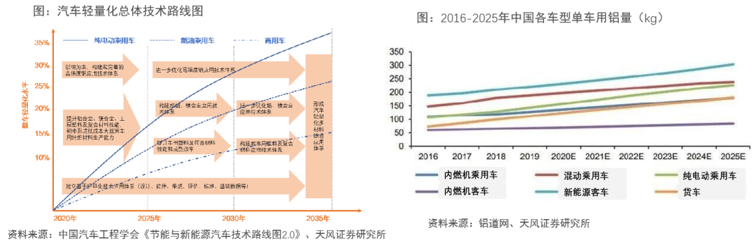 双碳背景下,轻量化是汽车行业发展的大趋势。根据国际铝业协会的相关数据,对于燃油车,重量与耗油量大致呈正相关关系,汽车质量每降低100kg,每百公里可节省约0.6L燃油,减排800-900g的CO2;对于电动车,重量与耗电量呈正相关关系,纯电动汽车整车重量若降低10kg,续驶里程则可增加2.5km。