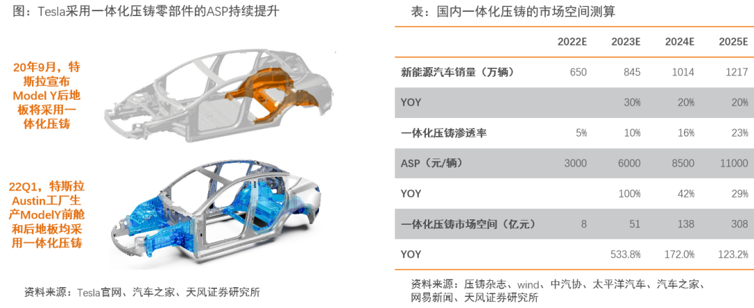 一体化压铸的国内市场空间有多大?目前特斯拉已将一体化压铸技术作为标准工艺进行布局,多家主机厂跟进布局一体化压铸技术。未来除外覆盖件外,其余车身结构件的冲压和焊接环节均可能被压铸工艺替代。一体化压铸零部件的ASP有望持续提升。我们预计从2023年开始一体化压铸的市场空间将迎来快速提升。据我们测算,国内一体化压铸的市场空间到2025年预计将达300亿以上的规模,2022-2025年的CAGR达238%。
