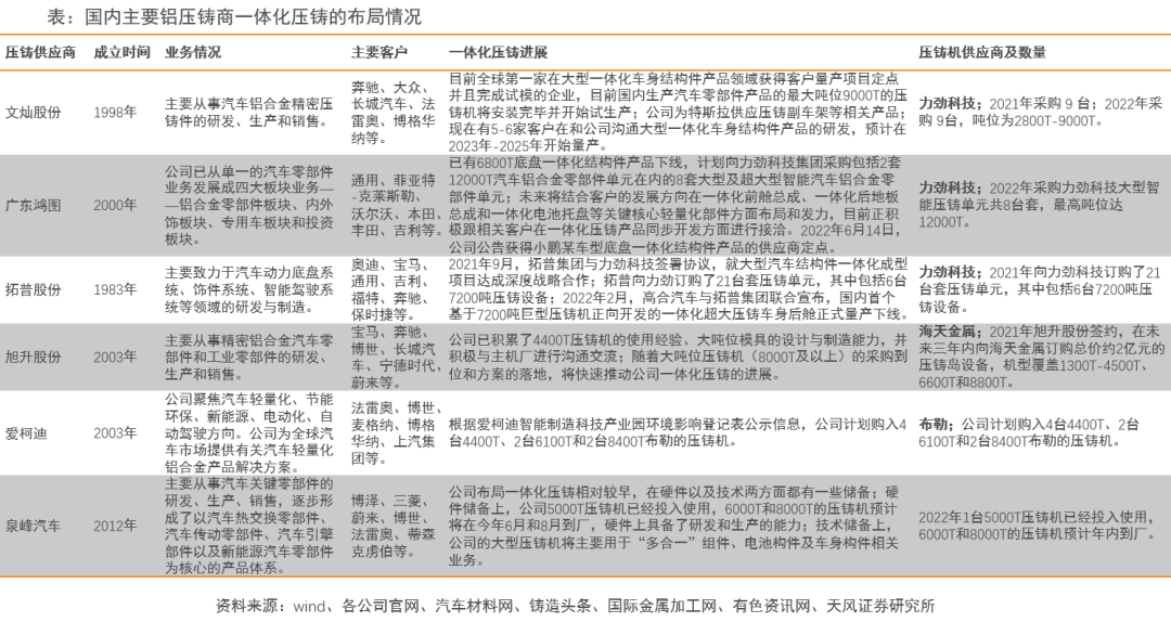 我国汽车行业的主要铝压铸商有:文灿股份、广东鸿图、拓普集团、泉峰汽车、旭升股份、爱柯迪等,目前各铝压铸企业都在加快一体化压铸布局当中。