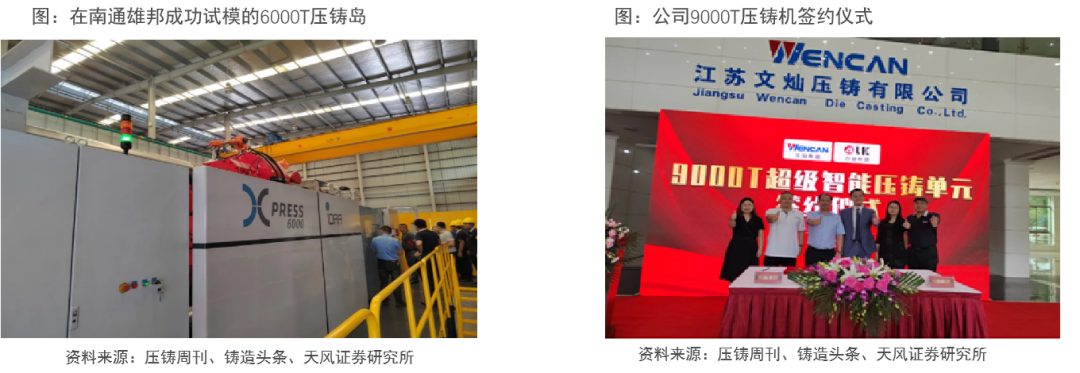 2021年8月,公司签约采购9000T巨型压铸机,2021年11月,雄邦压铸的6000T超大型压铸岛在江苏南通生产基地成功试模,采用一体化压铸成型的汽车零部件成功下线。