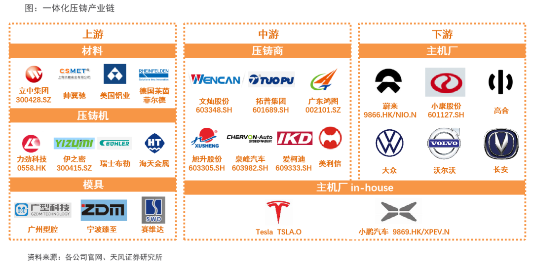 产业链上中下游联动,共同布局推进一体化压铸的应用。一体化压铸产业链上游主要为材料、设备和模具,中游为压铸商,下游客户主要为主机厂。