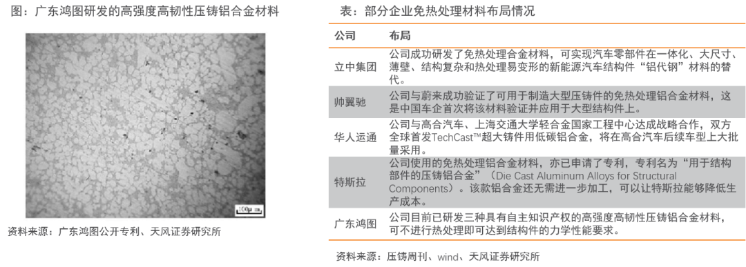 从当前市场竞争格局上看,国内外均有企业开发和推广免热处理铝合金材料,其中包括了立中集团、帅翼驰、华人运通与上海交大、广东鸿图、特斯拉、美国美铝、德国莱茵菲尔德等。目前,特斯拉已将自研专利“用于结构部件的压铸铝合金” 应用于一体化压铸当中,既坚固又具有出色延展性,有效降低了特斯拉相关生产成本。