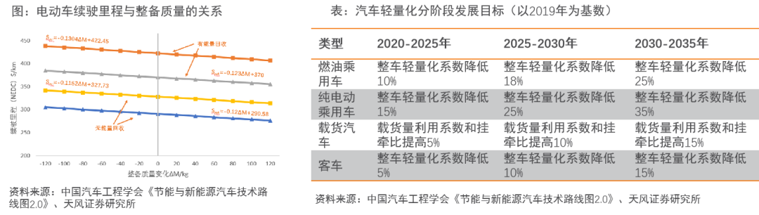 根据规划,到2035年燃油和电动乘用车的整车轻量化系数将分别比2019年的基数下降25%和35%。中国汽车工程学会的团体标准《乘用车整车轻量化系数计算方法》,定义了整车轻量化系数。该系数通过名义密度(M/V)、质量功率比(M/P)和脚印油耗/电耗(Q/A、Y/A)来衡量整车轻量化程度。根据《节能与新能源汽车技术路线图2.0》,到2025/2030/2035年,燃油和电动乘用车的整车轻量化系数,将分别比2019年降低10%/18%/25%和15%/25%/35%。