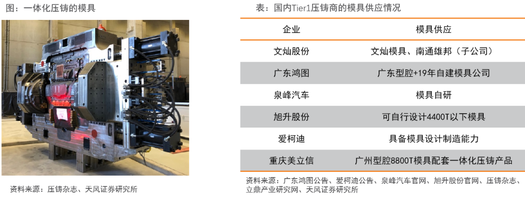 大型模具生产壁垒:一体化压铸的零件,结构复杂、制造费用高、准备周期长,对于压铸模具的生产提出了更高的要求,部分Tier1压铸商缺乏大型模具自研设计能力。随着超大型一体车身轻量化的大步推进,广州型腔、宁波臻至、宁波赛维达等模具企业均有所参与。