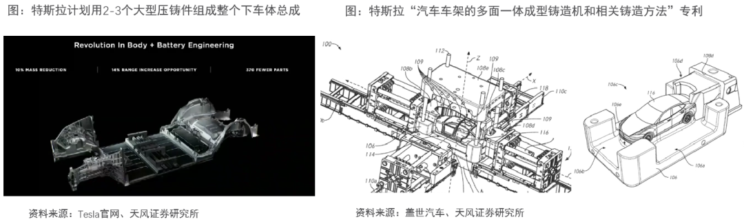 下车体总成一体压铸成型为特斯拉的发展方向。特斯拉宣布下一步计划将应用2-3个大型压铸件替换由370个零件组成的整个下车体总成,重量将进一步降低10%,对应续航里程可增加14%。