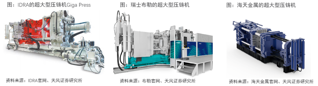 一体化压铸对压铸机的锁模力有较高要求。特斯拉所订购的压铸机的锁模力高达6000T和8000T,目前具备此类超大型压铸机生产能力的厂商主要有瑞士布勒、力劲科技及其子品牌IDRA、海天金属、伊之密等。