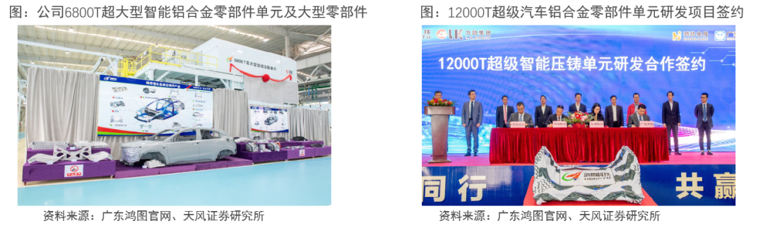 2021年6月,公司旗下控股子公司-雄邦压铸(南通)有限公司大型一体化铝合金压铸工程开工建设。项目将安装7套大型智能压铸单元,包括两套6000吨、三套4500吨、一套3500吨、一套2800吨,主要部署新能源汽车等领域大型结构件、一体化压铸件的生产。该7套压铸单元将于2022年1月完成全部交付,预计2022年6月实现全线量产,计划主要生产大型一体化车身结构件和一体式电池盒托盘。