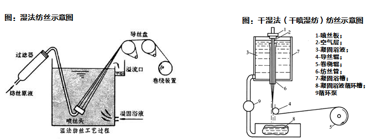 湿法纺丝:将纺丝原液经过滤、脱泡,通过计量泵从喷丝头挤出,在凝固浴的作用下,原液细流凝固形成一层膜,凝固剂扩散到细流内部,而细流中的溶剂也通过皮层扩散到凝固浴中,经过双扩散成型,适当的喷丝头拉伸形成初生纤维,湿法成本较低,但纺速较慢。