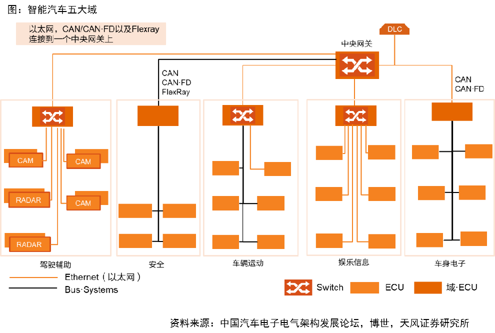 博世、大陆等Tier1 将当前汽车 E/E 架构按功能划分为动力域(安全)、底盘域(车辆运动)、座舱域(信息娱乐)、自动驾驶域(辅助驾驶)和车身域(车身电子)五大区域。