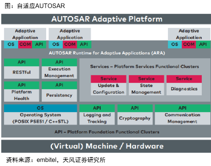 AUTOSAR可提供标准的接口定义、软件模块化设计,从而令软件及其组件不受硬件影响。经典 AUTOSAR 主要面向基于电子控制单元(ECU)的传统汽车嵌入式软件,自适应 AUTOSAR 主要面向更为复杂的基于域控制器或中央计算平台的汽车电子软件。其中,自适应 AUTOSAR 相较于经典 AUTOSAR 能够更好支持强大算力的多核 SoC、服务可灵活部署、支持空中升级(OTA)等优势。