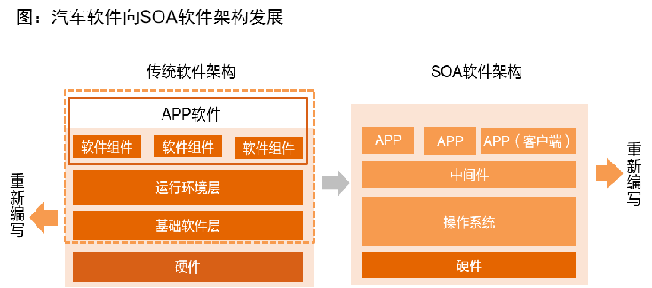 汽车软硬件解耦后,汽车电子软件可实现各功能间的交互,汽车电子软件从依赖于硬件提供单一功能架构转变为面向服务架构(SOA),SOA软件架构下底层软件具备接口标准化、相互独立、松耦合三大特征,各个“服务”相互独立且唯一,具有界定清晰的功能范围,留予标准化的访问接口,升级或新增某项功能只需调用接口即可,且软件架构独立于车型、硬件平台、操作系统及编程语言,将传统中间件编程从业务逻辑分离。